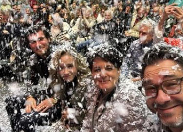flakes, but a very thick layer. So much so that the audience enthusiastically started real "snowball fights"