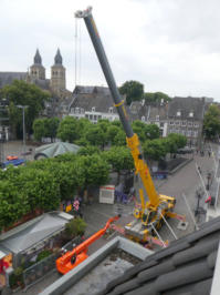 A huge yellow crane, lifting a smaller orange crane to put it on a truck. André is watching the big job.