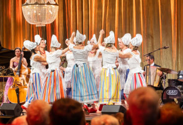 female members of the Johann Strauss Orchestra appear on stage in Volendam traditional dress to