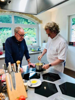 André Rieu with guests including his favorite Dutch pastry chef, Cees Holtkamp (far right), after the Christmas concert at the MECC in Maastricht, Netherlands on December 7, 2025 Pierre Rieu photobombed the scene in the background! Photo: Cees Holtkamp Marc Rieu and Pierre Rieu surprised André for his 71st birthday on October 1, 2020 (during COVID-19), by inviting pastry chef Cees Holtkamp to provide a baking workshop at André's home. Photo: André Rieu Productions